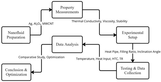 The experimental methodology for the heat pipe performance analysis was systematically structured and comprised key stages to ensure accurate and comprehensive results. The process began with nanofluid preparation, where nanoparticles were dispersed in deionized water at varying concentrations. Ultrasonication and surfactants were used to achieve stable suspensions. Following this, property measurements were conducted to evaluate the thermal conductivity, viscosity, specific heat capacity, and stability of the nanofluids using advanced analytical instruments.