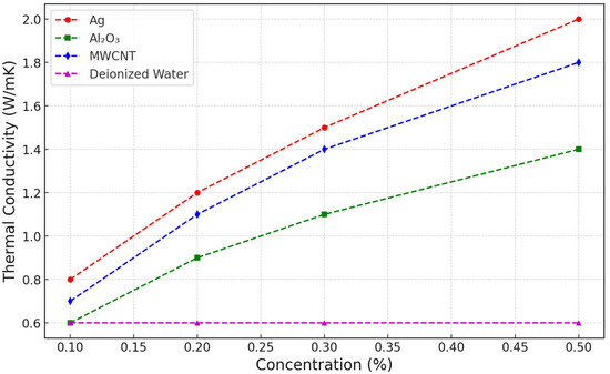 3, and MWCNTs into deionized water, significant improvements in key thermal parameters, including thermal conductivity, HTC, and TR, were observed. Ag nanofluids demonstrated the most substantial gains, with a 150% increase in thermal conductivity and an 83% reduction in TR, highlighting their exceptional heat dissipation capabilities. MWCNT and Al