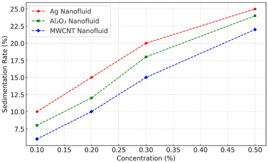 46]. This study also highlights the challenges of stability and sedimentation, particularly at higher nanoparticle concentrations. While techniques such as ultrasonication and surfactant addition were effective in minimizing sedimentation, long-term stability remains a concern that warrants further investigation. The results underscore the importance of addressing these challenges to facilitate the practical application of nanofluids in industrial thermal management systems.