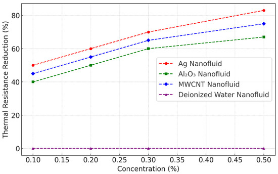 TR was observed to decrease with increasing nanoparticle concentration across all nanofluids. For Ag nanofluids, TR decreased from 0.3 °C/W at a 0.1% concentration to 0.1 °C/W at 0.5%. Al