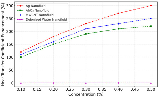 34]. Ag nanofluids demonstrated the highest improvement due to their inherently high thermal conductivity and the ability to maintain a stable liquid–vapor phase interface at elevated temperatures.