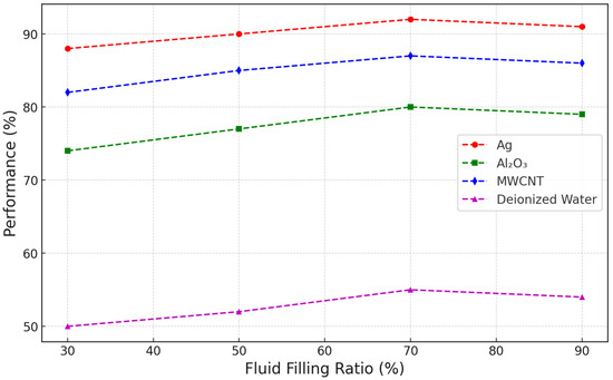 3, MWCNT, and deionized water—relative to the fluid filling ratio (%) in a heat pipe. The performance generally improves as the fluid filling ratio increases, reaching a peak at 70%, followed by a slight decline at 90%. Among the nanofluids, the Ag nanofluid exhibits the highest performance, reaching approximately 92% at 70% filling, indicating superior thermal conductivity and enhanced heat transfer efficiency [