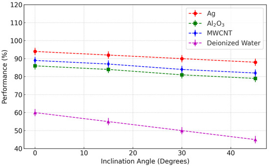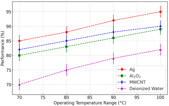 Figure 15). A linear improvement in performance was observed across all fluids with increasing temperature. At 100 °C, Ag nanofluids achieved the highest performance at 95%, followed by MWCNTs and Al