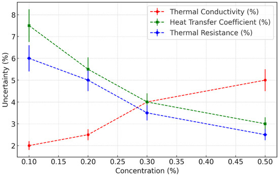 36]. TR exhibited uncertainties of ±2.5% to ±6.0%, primarily influenced by temperature measurement accuracy and heat input variability. The results of the uncertainty analysis are shown in