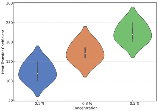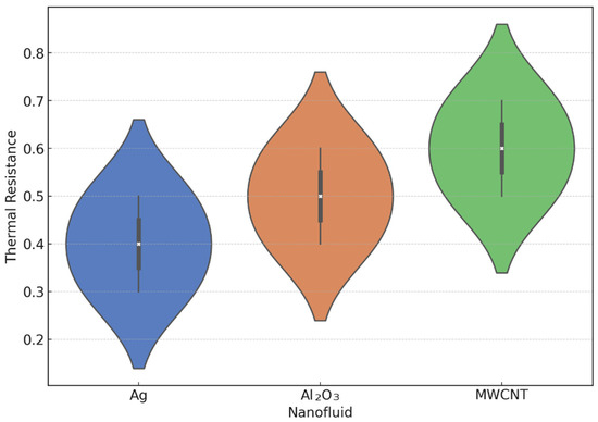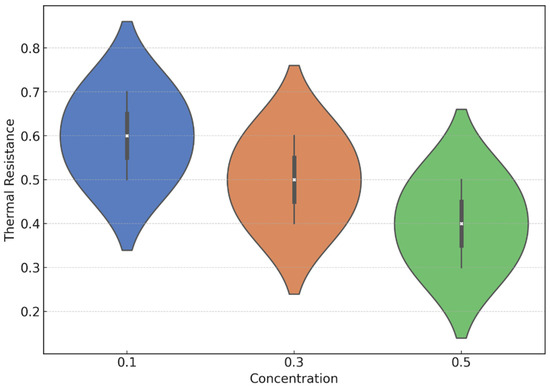 Figure 17). At a concentration of 0.1%, the median TR was approximately 0.65 °C/W, while at 0.5%, it decreased to approximately 0.35 °C/W, representing a 46% reduction. The narrowing of the violin shapes at higher concentrations indicated reduced variability, suggesting that higher nanoparticle concentrations led to more consistent thermal performance.
