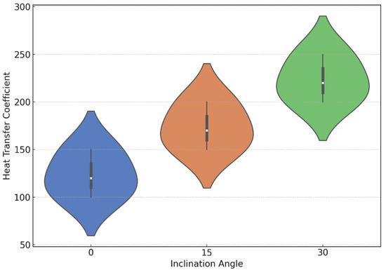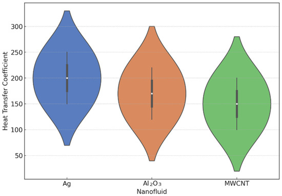 3, and MWCNTs), and inclination angles (0°, 15°, and 30°). The data were reviewed to identify and address missing or inconsistent values, and any outliers were evaluated through exploratory data analysis to ensure the dataset’s suitability for statistical modeling. Violin plots were generated to visualize the distributions of TR and HTCs concerning each parameter. These plots provided insights into the trends, variability, and central tendencies for different parameter combinations. Both distribution profiles and overlaid data points were included in the plots to highlight the spread and median values effectively [