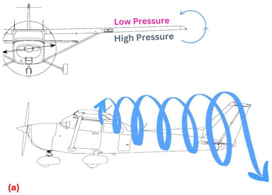 where CL is the lift coefficient, AR is the aspect ratio, e is the efficiency factor and π is equal to 3.14. Fundamentally, lift generation is dependent on the formation of a pressure difference between the upper and lower surfaces of the wing [7]. Due to this pressure difference, the region near the tip of the wing experiences a flow of high-pressure air from beneath the wing moving to a low-pressure region above, resulting in the formation of wingtip vortices which contribute to induced drag. Wingtip vortices are the swirling air motion that trails behind the wing. When viewed from behind, these vortices rotate counterclockwise around the right wingtip and clockwise around the left wingtip. When these vortices combine, it generates a downward airflow known as downwash, which reduces the lift and increases drag [8]. Figure 1a,b illustrate this phenomenon.