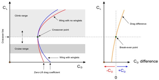 Controlling the induced drag generated at the wingtips is crucial for enhancing efficiency. To minimise induced drag, the most common solution is the addition of winglets. These devices are fixed at the wingtips to obstruct the circulation of high-pressure air from below the wing to the lower-pressure area above it. Winglets also introduce secondary vortices that disrupt the primary vortices. During the 1980s, the Boeing Company produced canted winglets on the Boeing 747-400 to increase the load-carrying capacity and range of the aircraft. A cant angle is defined as the angle between the vertical axis and the winglet. However, winglets may not perform optimally in all phases of flight. Guerrero et al. noted that winglets can generate parasitic drag (in their Onera M6 wing with a 3.06 angle of attack analysed at 0.8 Mach using the K-omega turbulence model), so their viability depends on whether the reduction in induced drag outweighs the increase in parasitic drag [28]. Figure 5 depicts the performance of two hypothetical wings with and without winglets. During the climb phase, winglets reduce overall drag for the same lift coefficient, justifying their use. However, during cruise, the reduction in lift-induced drag is lower than the additional increase in parasitic drag.