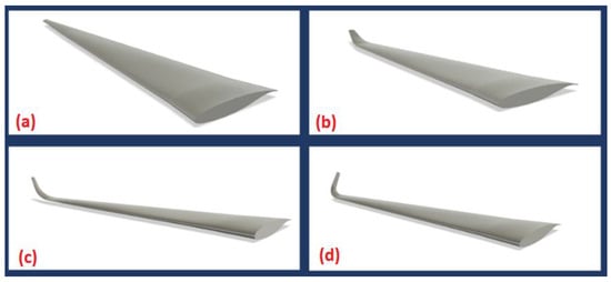 The A380 wing models with blended winglets at different cant angles: (a) 0 degrees, (b) 15 degrees, (c) 45 degrees and (d) 80 degrees.