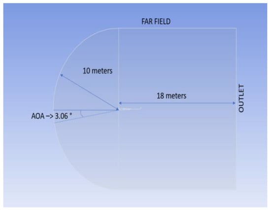 The wing model was imported into the Ansys Design Modeler 2024 R1, where a C-type computational domain was created, as shown in Figure 9. This boundary extends 10 m in front of the wing and 18 m behind it. A C-grid domain creates a high-density region in crucial areas along the wing’s top and lower surfaces, where flow perturbations are most significant. This configuration excels at resolving the wake region behind the wing, accurately simulating vortex generation [34]. The concentrated grid distribution enhances the accuracy of predicting pressure distribution and shock location, especially in transonic flows. A body of influence was added near the wing to improve mesh refinement in that region, resulting in better simulation outcomes. The entire domain was converted to a fluid domain, setting up the simulation to model fluid flow around the wing. The wing model itself was subtracted from the domain using a Boolean command, effectively creating a void in the fluid domain where the wing model is positioned. This ensures an accurate representation of the airflow interaction with the wing.