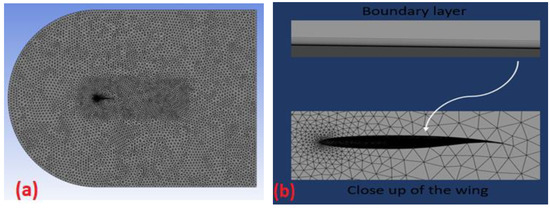 In Ansys Meshing, the primary element size was set to 0.2 m and body sizing was applied to the body of influence with an element size of 0.15 m to refine the mesh in areas near the wing, where capturing flow characteristics is critical. To accurately capture the wing’s surface geometry, face meshing was employed. Furthermore, an inflation layer was added to the mesh. The first layer height was set to match the wall y-plus value, ensuring proper resolution of the boundary layer. In this case, the first layer height was set at 5.1 × 10−6 m, calculated to achieve a wall y-plus value of one [35]. The bulk of the mesh consists of tetrahedral cells, and they offer flexibility and precision, especially in complex geometries [36]. The mesh obtained has an average skewness of 0.24 and an average orthogonal quality of 0.75, indicating good mesh quality. Skewness measures how closely the mesh elements match ideal geometric shapes, with lower values indicating less distortion [37]. An inflation layer was used on the wing to add the first layer thickness to achieve a y-plus value of 1. The orthogonal quality evaluates how perpendicular adjacent mesh elements are, with higher values indicating better alignment. Overall, these metrics suggest that the mesh is of good quality. Figure 10 displays the complete mesh along with a close-up of the boundary layer.