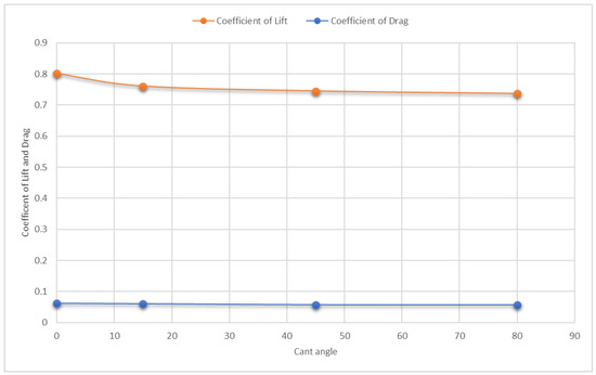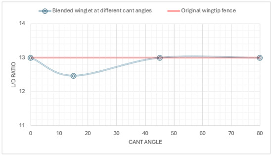 Figure 12 illustrates that the wing with a blended winglet and zero-degree cant angle increases the coefficients of lift and drag to 3.886% and 8.621%, respectively. At a fifteen-degree cant angle, the drag increases by 5.172% with no significant change in the coefficient of lift. At forty-five degrees, the coefficient of drag remains constant. At eighty degrees, the coefficient of lift decreased by 4.533% with no major variation in the coefficient of drag. This research proves that changing the cant angle has an impact on aerodynamic forces, i.e., lift could be increased by up to 3.89% and drag could be reduced by up to 1.724% and the lift-to-drag ratio can be stabilised at 13. Overall, the changes in aerodynamic performance remain relatively consistent across different cant angles (especially at 15 and 45 degrees). Hence, these blended winglet designs can be used as an alternative for a wingtip fence on A380 aircraft.
