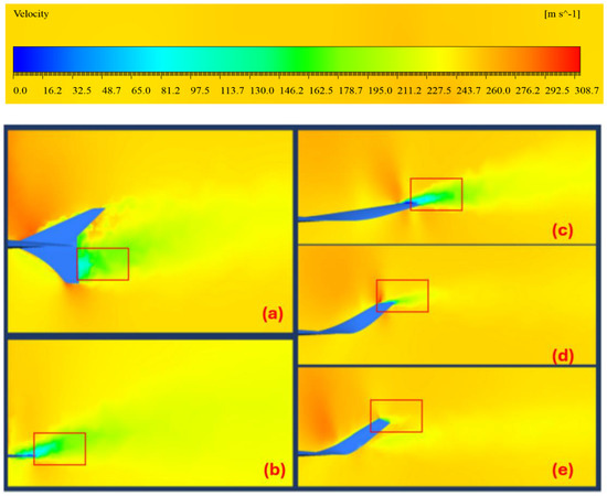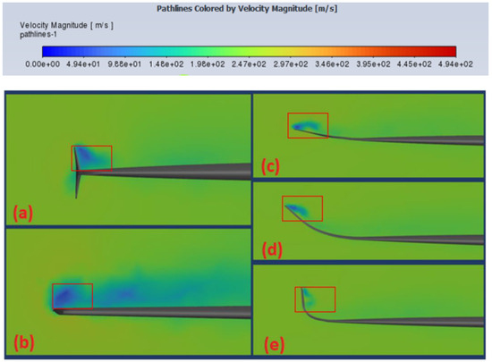Figure 13 and Figure 14 clearly show that the size of the wingtip vortex was reduced from a larger level, as shown in Figure 13a and Figure 14a, to a much smaller level, as shown in Figure 13c–e and Figure 14c–e. This was due to the addition of winglets, which lifted the vortices from the wingtip to a height further away from the main wing surface. This reduced the influence of wingtip vortices on the main wing surface and hence resulted in improved aerodynamic values. Moreover, the size of the disturbance was reduced by using winglets at different cant angles. In terms of lift, the wing with a winglet at a zero-degree cant angle performed well. In terms of drag, the wing with a winglet at an 80-degree cant angle performed well.