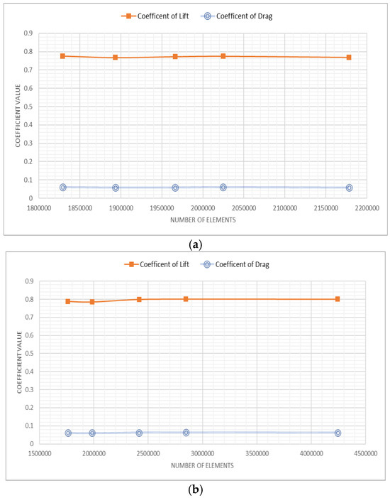 Performing a mesh convergence analysis, also known as a grid dependency study, is crucial for understanding the impact of cell size on the simulation error. As the cell size decreases, spatial discretisation errors also decrease [46]. Achieving mesh independence indicates that additional refinement in the mesh has minimal influence on the simulation outcomes. This process is vital to achieve stable and reliable simulation results. Two separate mesh convergence studies were conducted. Figure 15a shows the mesh-independent studies of the A380 wing with a wingtip fence that were conducted using five different meshes ranging from 1.8 to 2.2 million elements. All of these simulations were evaluated at a 3.06-degree angle of attack. Similarly, a mesh-independent study was conducted for the A380 wing with blended winglet configuration at a zero-degree cant angle using five different meshes ranging from 1.7 to 4 million elements. The results stabilised after 2.7 million elements and are depicted in Figure 15b.