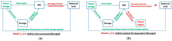 Each scenario explored different energy flows depending on the MG type (selfish or collaborative) and the backup generation solution. Therefore, it is worth illustrating the power flows of the different scenarios. In Figure 6, all four scenarios for Model 1 (selfish MG) were presented. Sc.1 in Figure 6a assumes that the selfish MG is using the utility grid only as a backup generation, where it consumes electricity when there is a shortage in renewable energy stored at the MG level. If there is excess energy more than the storage capacity, the MG exports this energy to the utility grid. In Figure 6b, the MG is considered an isolated MG and depends on a diesel generator as the backup generator when it has a shortage in stored energy, but it exports the excess power to the utility grid. Model 1-Sc.3 illustrated in Figure 6c also for isolated MG depends on an H2 burner as the backup generation, but in this case, an additional storage (H2 tank) is added to the MG system to absorb the excess power. So, instead of exporting this power to the grid, it will be converted to H2 using an electrolyzer and stored in an H2 tank. The H2 burner’s supply comes from this additional storage if available, and if there is a shortage in the additional storage, the MG will have to buy H2 from an external supplier. Sc.4 for the selfish MG illustrated in Figure 6d is the same as the previous scenario (Model 1-Sc.3); the only difference is that instead of buying H2 from an external supplier to compensate for the additional storage shortage, the MG will use the diesel generator.