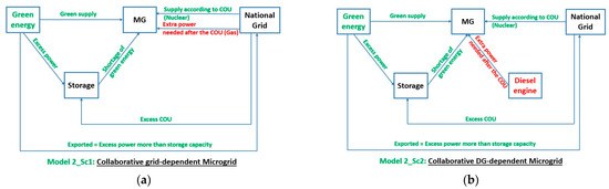 Figure 7 depicts all four scenarios for Model 2 (collaborative MG). Sc.1, as shown in Figure 7a, proposes that the collaborative MG relies solely on the utility grid for backup generation, with the supply from the utility grid adhering to the COU strategy. This supply is prioritised for consumption before the renewable energy available in the system, and in the event of a shortage, the MG procures additional supply from the grid. The surplus COU supply is stored in the storage system, while any renewable energy exceeding the storage capacity is sent to the utility grid. Figure 7b depicts the MG depends on a diesel generator as a backup when there is a shortage in the COU supply from the grid, and it exports surplus electricity to the utility grid. For Model 2-Sc.3 in Figure 7c, the MG utilises an H2 burner for the COU supply’s backup generation; however, an additional storage component (H2 tank) is incorporated into the MG system to store surplus power. Rather than exporting this energy to the grid, it will be converted to hydrogen using an electrolyser and stored in a hydrogen tank. The H2 burner’s supply is sourced from this additional storage, and in the event of a deficiency in the additional storage (H2 tank), the MG will need to get H2 from an external supplier. Sc.4, the last scenario for the collaborative MG illustrated in Figure 7d, uses a diesel generator rather than procuring hydrogen from an external supply, as was the case in the preceding scenario, to address the additional storage deficiency.