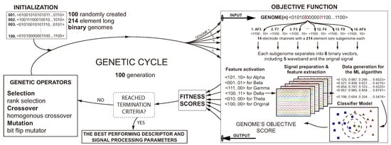- Li, Y.; Wu, L.; Wang, T.; Gao, N.; Wang, Q. EEG Signal Processing Based on Genetic Algorithm for Extracting Mixed Features. Int. J. Pattern Recognit. Artif. Intell. 2019, 33, 1958008. [Google Scholar] [CrossRef]