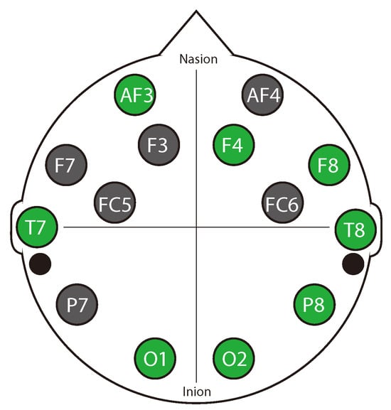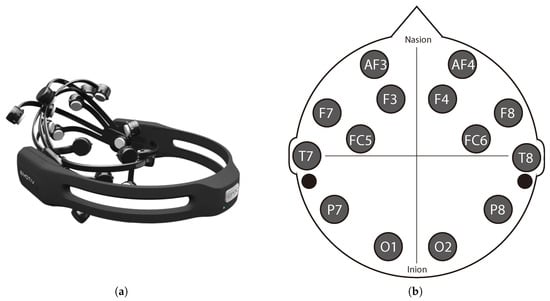 For the project, the EEGIS (Electroencephalogram Imagined Speech) dataset [24] was used, where the inclusion criterion was that the participants were between the ages of 20 and 30. The participants had an average age of 24.8 years, with a standard deviation of 2.04. The signals were obtained using a 14-channel Emotiv Epoc+, as shown in Figure 3a, and these were recorded at 128 Hz. The channels are specified in Figure 3b.