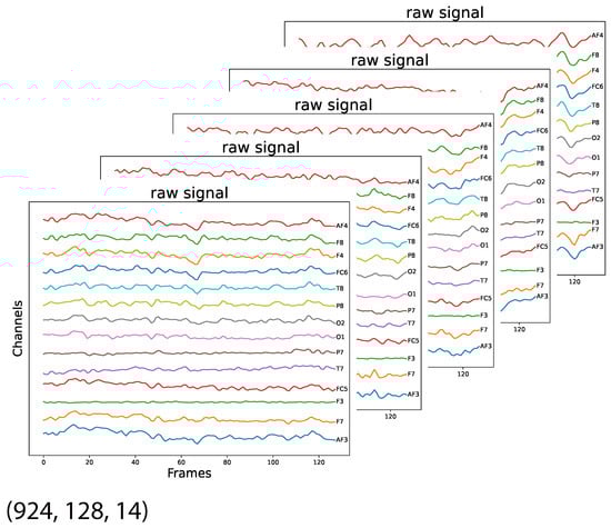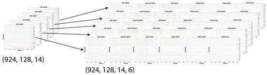A 4th-order band-pass Butterworth filter was used with cut-off frequencies (Table 1) to separate each of the 14 channels into five frequency bands associated with brain rhythms (Figure 5). The shape of the data tensor (924, 128, 14) became 4D (924, 128, 14, 6), where six corresponds to the raw signals plus the five frequency bands.