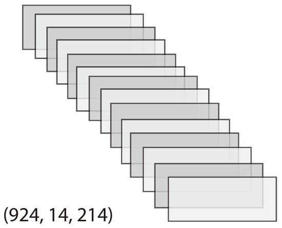 Feature vectors of size 214 were constructed, with each vector comprising 36 features extracted from six different layers of the same signal: the original signal and five frequency bands. Specifically, the first 34 features were derived from the raw unit signals, while 36 were from each frequency band. Altogether, these features add up to 214, forming the feature maps. The features were extracted from the 14 channels; therefore, the shape of the feature maps was (14, 214), as shown in Figure 6.