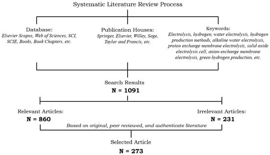 A wide range of keywords, including “water electrolysis”, “hydrogen production”, “efficiency”, “optimization”, “catalyst”, “electrode materials”, “nanomaterials”, “renewable energy integration”, “cost reduction”, “proton exchange membrane (PEM) electrolysis”, “alkaline water electrolysis (AWE)”, “solid oxide electrolysis cell (SOEC)”, “anion exchange membrane (AEM) electrolysis”, “high-temperature electrolysis”, and “low-temperature electrolysis”, were employed to construct this review paper. Keyword searches were performed using Boolean operators, combining terms such as ‘water electrolysis’ AND ‘hydrogen production’ OR ‘efficiency improvement’ to refine results. The search was repeated across different databases to ensure comprehensive coverage. The selection of publications prioritized factors such as the reliability and validity of data, recency of research, relevance, impact factors, citation count, and utility of the articles. Data collection was conducted manually through content analysis, extracting critical information such as article type, journal name, year of publication, topic, title, research methodology, relationships between variables, indicators, and research findings. The articles retained after the final screening provided a comprehensive foundation for evaluating the synergies between electrolysis technologies, energy efficiency improvements, and cost-effective hydrogen production.