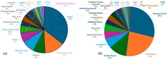 Figure 4a classifies electrolysis studies based on membrane type, with titanium porous transport layers, Nafion 115 membranes, and co-crystallized catalyst-coated membranes being the most commonly used. Figure 4b highlights the frequent use of platinum-based catalysts, indicating their widespread preference in electrolysis research.