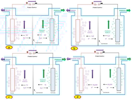 Schematic of the working principles of (a) AWE, (b) PEM electrolysis, (c) SOEC, and (d) MEC.