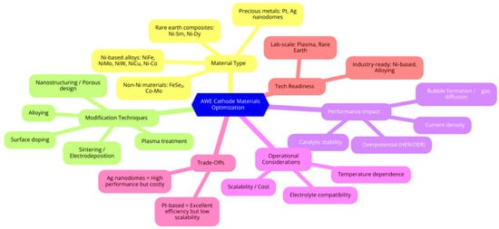Mind map summarizing cathode optimization strategies in alkaline water electrolysis. The figure highlights material types, fabrication techniques, performance outcomes, trade-offs, and technology readiness levels.