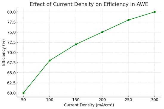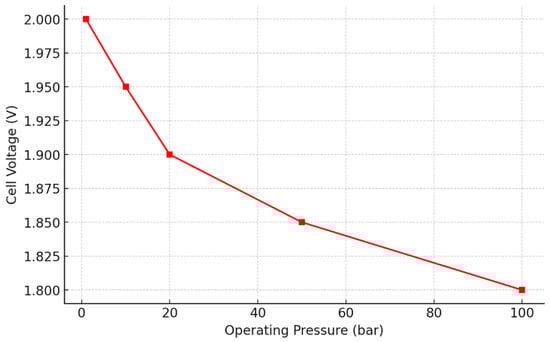 The efficiency of AWE is also influenced by operating pressure (Figure 10). Suermann et al. studied the impact of pressures up to 100 bars on cell voltage behavior and observed that lowering the pressure reduced mass transport losses, thereby improving overall system efficiency [75]. Koi et al. analyzed the environmental impact of high pressure AWE systems, focusing on innovative membrane technologies. Their findings revealed that while improved membranes enhanced performance, the primary environmental impact stemmed from the electricity required for operation, emphasizing the need for renewable energy integration to minimize the carbon footprint [76]. Todd et al. have also performed electrolysis by increasing pressure (up to 100 MPa) at operating temperatures (up to 1000 K) and demonstrated lower energy requirements, albeit with electrical [77].