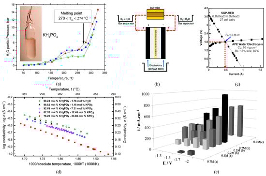 The plot in Figure 9a shows the relationship between the partial pressure of H2O and temperature for KH2PO4. This was determined by Raman spectroscopy, using relative ratios of Raman scattering cross-sections of CH4 and H2O [41]. As the temperature increases, the partial pressure of water also rises, showing an exponential trend, especially above 200 °C. The melting point of KH2PO4 is marked at 270 °C, with an uncertainty of ±2 °C. This suggests that as the salt approaches and surpasses its melting point, the release of water becomes more significant, possibly due to phase change behavior and enhanced vaporization. Figure 9d shows a plot of the logarithm of conductivity versus inverse absolute temperature (1000/T) for different electrolyte molarities. This is a typical Arrhenius-type plot, where conductivity decreases with increasing 1000/T, indicating enhanced ion mobility at higher temperatures. Different symbols represent various electrolyte concentrations (e.g., 5 M Na3PO4, 3 M Na3PO4 + 2 M KH2PO4, etc.). Higher concentrations generally show higher conductivity, emphasizing the role of electrolyte composition in improving ionic transport. Figure 9e presents the polarization curves showing current density versus potential at varying electrolyte molarities (e.g., 0.1 M, 0.2 M, 0.3 M, etc.). As the applied potential becomes more negative, the current density increases—characteristic of cathodic reactions such as HER. Moreover, higher molarity electrolytes yield greater current densities at a given potential, reflecting reduced ohmic losses and improved ionic transport. This demonstrates the beneficial role of electrolyte concentration in enhancing the electrochemical performance of the system. Considering the fact that the membrane has a crucial role to play when it comes to efficiency in AWE, Aili et al. equilibrated the membrane in 22 wt.% aqueous KOH. This modified version of the porous poly(perfluorosulfonic acid) membrane was seen to deliver significantly higher ion conductivity (0.2 S/cm) even at room temperature, as opposed to the unmodified membrane (0.01 S/cm) [71].