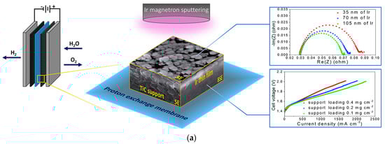 (a) Location of TiC support membrane in PEMWE [93], (b) curve between mass activity and anode loading [96], (c) plot between efficiency and time for different electrode compositions [95], (d) effect on efficiency at different IrO2 loadings [94], (e) curve between current density and cell voltage when the IrO2 membrane was doped with fluorine [97], and (f) curve between current density and cell voltage when RuO2 was used with IrO2 [99]. (Adapted with permission).