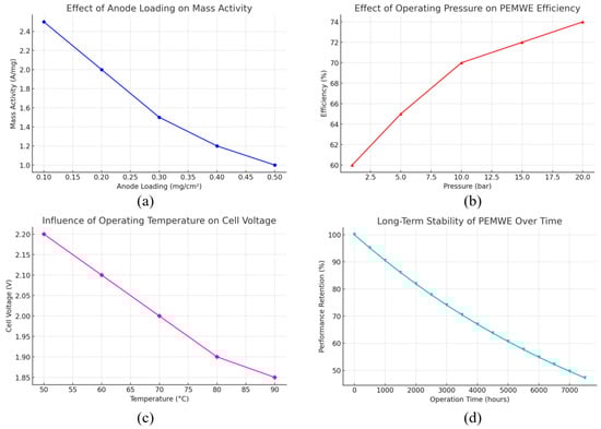 Performance characteristics of PEM water electrolyzers: (a) Effect of anode loading on mass activity, (b) Effect of operating pressure on PEMWE efficiency, (c) Influence of operating temperature on cell voltage, and (d) Long-term stability of PEMWE over time.