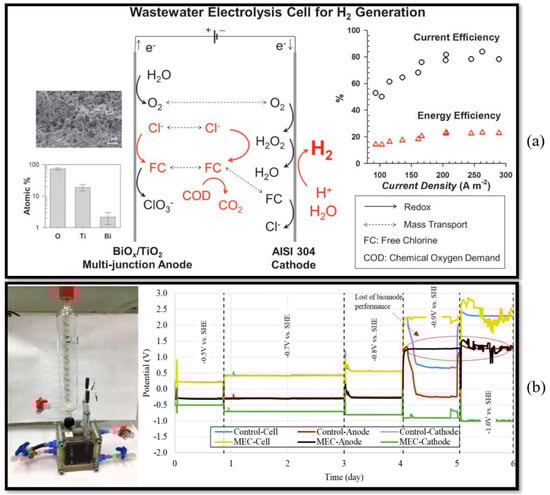 - Cho, K.; Hoffmann, M.R. Molecular hydrogen production from wastewater electrolysis cell with multi-junction BiOx/TiO2 anode and stainless steel cathode: Current and energy efficiency. Appl. Catal. B Environ. 2017, 202, 671–682. [Google Scholar] [CrossRef]
