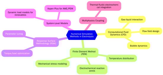 Alkaline, polymer electrolyte membrane, solid oxide, and microbial electrolysis cells have been widely studied, each with unique advantages and challenges. Research has improved electrode materials, catalysts, electrolytes, and operating conditions, yet key issues persist, including energy losses from overpotential, internal resistance, and mass transport limitations. Electrode degradation, membrane instability, and gas bubble formation further reduce efficiency and increase energy consumption, necessitating systematic optimization [10,11]. Computational modeling and finite element analysis are crucial for optimizing electrolysis by providing insights into electrochemical kinetics, ion transport, thermal stability, and mechanical integrity. Simulations such as computational fluid dynamics and multi-physics modeling enable better system design, yet a gap remains in integrating numerical models with experimental validation, limiting predictive accuracy and scalability.