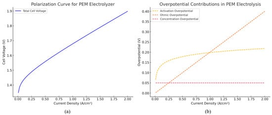 Proton exchange membrane (PEM) electrolysis was developed in 1966 as an advanced alternative to AWE, addressing limitations such as low current densities, carbonate formation, low gas purity, and operational pressure constraints. In PEM electrolysis, a solid polymer electrolyte (SPE) serves multiple critical functions, including electrical insulation of electrodes, proton conduction, and efficient separation of product gases (Figure 6b). The fundamental electrode reactions, charge carrier transport, and overall cell operation in PEM electrolysis are detailed in Table 3.