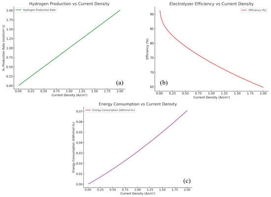 Operational parameters, including temperature, pressure, and current density, also play a crucial role in PEMWE efficiency (Figure 12). The Figure 12 illustrates how temperature, pressure, membrane thickness, and current density affect overall system efficiency. Efficiency increases with temperature due to enhanced reaction kinetics and lower ohmic resistance, while higher current densities reduce efficiency due to elevated overpotentials. Membrane thickness influences ohmic losses, and pressure impacts thermodynamic potential. Higher temperatures improve reaction kinetics and electrode activity, but excessive thermal exposure can accelerate degradation rates.