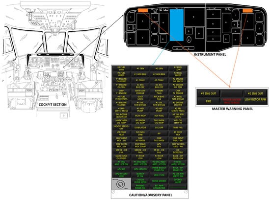 The interaction between the master warning panel and the Caution and Warning Panel is crucial for managing operational alerts. When the Caution/Advisory Panel detects a system failure, it sends a signal to the master warning panel. This signal activates the capsule labeled “Master Caution Press to Reset”, turning it ON. This capsule not only alerts system failures detected by the Caution and Warning Panel but can also signal issues in any other helicopter system. Additionally, it incorporates a reset function that allows the pilot or co-pilot to turn off the capsule and deactivate the alert, both in the Caution/Advisory Panel and other aircraft components. This reset capability is vital for efficiently managing and resolving alerts during flight [26]. Figure 2 shows the location of the master warning panel and the Caution/Advisory and warning panels in UH 60 helicopters.
