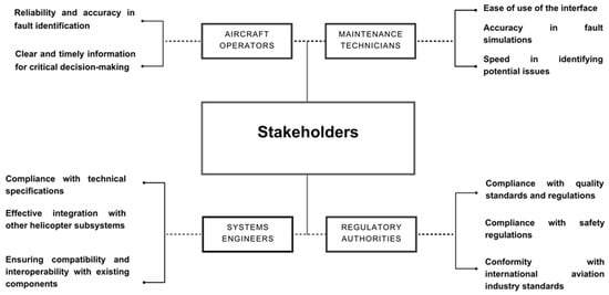 Regarding this, the stakeholders involved in developing and implementing the UH-60 test bench for fault diagnosis include aircraft operators, maintenance technicians, systems engineers, equipment manufacturers, and aviation regulatory authorities. Each of these groups has specific expectations and needs that must be identified and managed appropriately to ensure the system serves its purpose efficiently and safely. The key stakeholders in this project are the UH-60 helicopter operators, who require a reliable system for early fault detection and verification of the operability of the warning systems before each mission. Maintenance technicians are the main users of the diagnostic interface, and their expectations focus on ease of use, accuracy of simulations, and the ability to identify potential problems quickly and effectively. Systems engineers and equipment manufacturers expect the system to meet technical specifications, ensuring effective integration with other helicopter subsystems. Finally, aviation regulatory authorities seek to ensure that the system complies with all safety requirements and international regulations. Figure 3 shows schematically the stakeholders and their expectations.