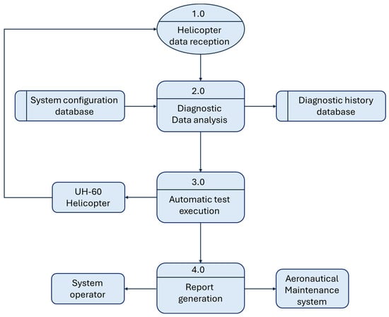 Generating and establishing technical requirements baseline were key steps in ensuring that stakeholder expectations were transformed into clear and detailed technical specifications. This process used modeling and analysis tools to break the expectations into specific technical components. To this end, the Data Flow Diagram (DFD) is an essential tool for modeling data processing in software engineering [38]. As shown in Figure 4, a DFD was developed to model and analyze the requirements. The DFD helped identify and document specific technical requirements, covering critical aspects of the system such as functionality, performance, security, and interoperability with other systems. The DFD provides a clear visualization of how data flows between the various components of the system [39], which was crucial to ensure that all important aspects were considered and properly addressed. For instance, it allowed us to define precisely how the system would capture diagnostic data from the UH-60 helicopter, how it would be processed and analyzed, and how automated tests would be generated based on these analyses. In addition, the diagram facilitated the identification of interaction points with other systems and the need to ensure that these points met the required interoperability standards.