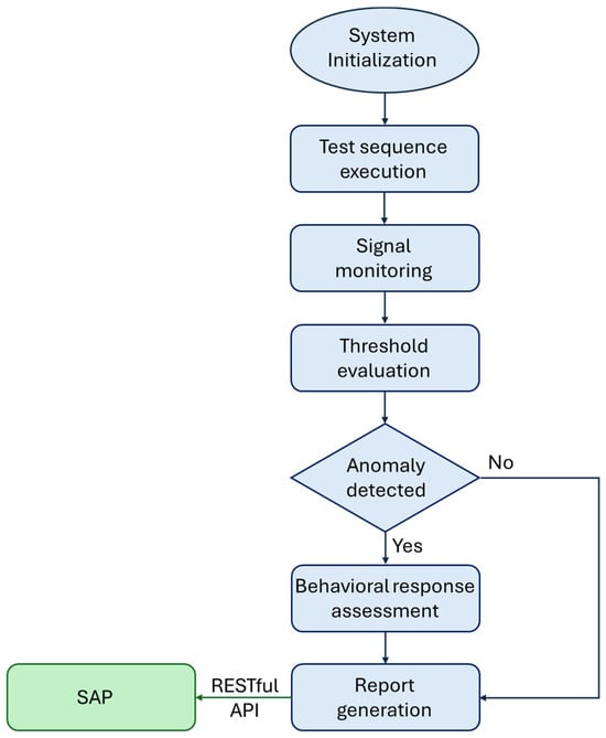 The test bench logic is based on a structured diagnostic sequence built into the software, which works within a closed-loop control framework. This logic facilitates automated fault injections, signal acquisition, threshold comparison, and decision-making processes under pre-set conditions. The sequence is performed with minimal human intervention and has been tuned to ensure repeatability, accuracy, and traceability in aircraft maintenance. The logic diagnostic procedure consists of the following steps: