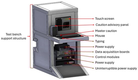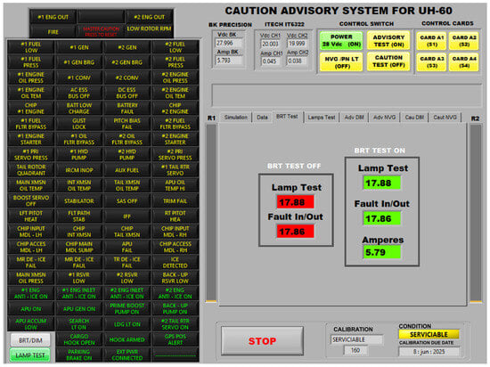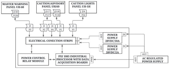 At the core of the system is the PXI 1085 Industrial Processor (National Instruments, Austin, TX, USA), integrated with Data Acquisition Boards, which functions as the central processing unit. The PCI eXtension for Instrumentation (PXI) is an extension of the Peripheral Component Interconnect (PCI) specification created to address industry needs for instrumentation and automation, both in terms of performance and reliability. Modularity is a key feature of PXI-based systems, aiming to maximize integrability and ease of use [45]. Beyond its primary function of real-time data acquisition and analysis, this component also plays a critical role in diagnosing potential faults in warning panels. The capability to efficiently acquire and process data is essential for detecting issues that may compromise the helicopter’s operability during actual flight conditions.
