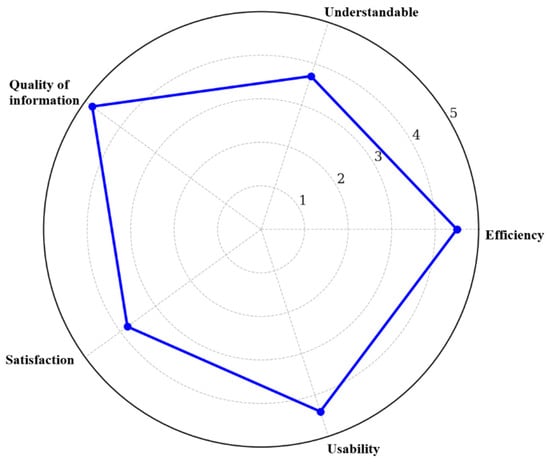 Overall, while the report is generally well-received, there are areas where the user experience could be optimized, and confidence in its regular use increased. Figure 9 graphically represents, on a numerical scale, the perception of the evaluated criteria. It shows that the diagnostic system performs strongly in efficiency, usability, and information quality, with potential improvement areas in satisfaction, particularly in the understandability of the generated reports.