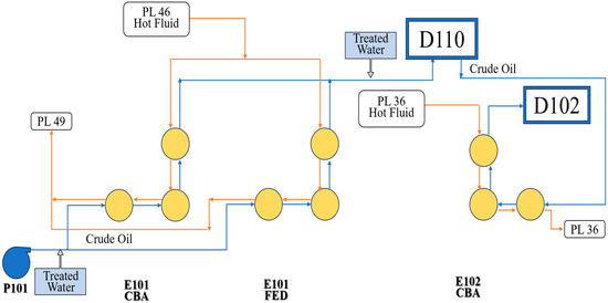The U100 atmospheric distillation unit is the main Algiers refinery unit (Algeria), and its purpose is to fractionate crude oil into different finished products such as kerosene, diesel, fuel, LPG, and light and heavy solvents that can be used in the composition of marketable products and reused for one or more treatments. One of the three centrifugal pumps, P101, pumps the crude oil from the storage tanks at room temperature to the unit of atmospheric distillation, which then passes through the two circuits of the E101 battery (CBA and FED) [29]. The crude oil passes through the tube side of the battery where it is heated using the overhead reflux (RT), a mixture of light products from the top of the distillation column C101 at tray N°46.