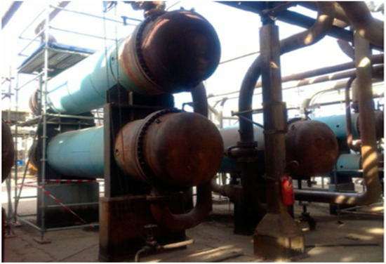This current study used data obtained from the heat exchanger cell E 101CBA (Figure 2), situated in the Algiers refinery’s preheating circuit, spanning 290 days from 14 March 2019 to 17 December 2019. This cell comprises three counter-current shell-and-tube heat exchangers arranged in series. The characteristics of these exchangers are detailed in Table 1 and Table 2.