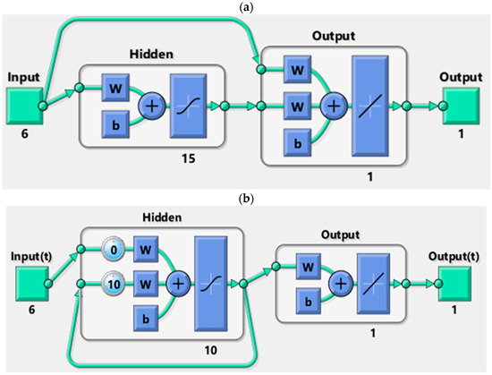 The cascaded forward network, as shown in Figure 4a, operates with a feedforward structure where each layer is directly connected only to the next layer, without any recurrent connections involving previous timesteps [33]. The input from the six mentioned parameters is processed through a hidden layer consisting of 15 neurons. Each neuron in the hidden layer is combined with weights (W) and biases (b) that allow for non-linear transformations. After the input passes through the hidden layer, the signal is processed by an activation function, producing the output from the hidden layer. The output from this hidden layer is then passed to the output layer, which consists of one neuron to generate a single output value at each time step. In this cascaded forward network, there is also a direct path from the input to the output layer, where some input information can directly influence the final result without passing through the hidden layer. This provides additional flexibility for the network to learn complex relationships between the input and output.