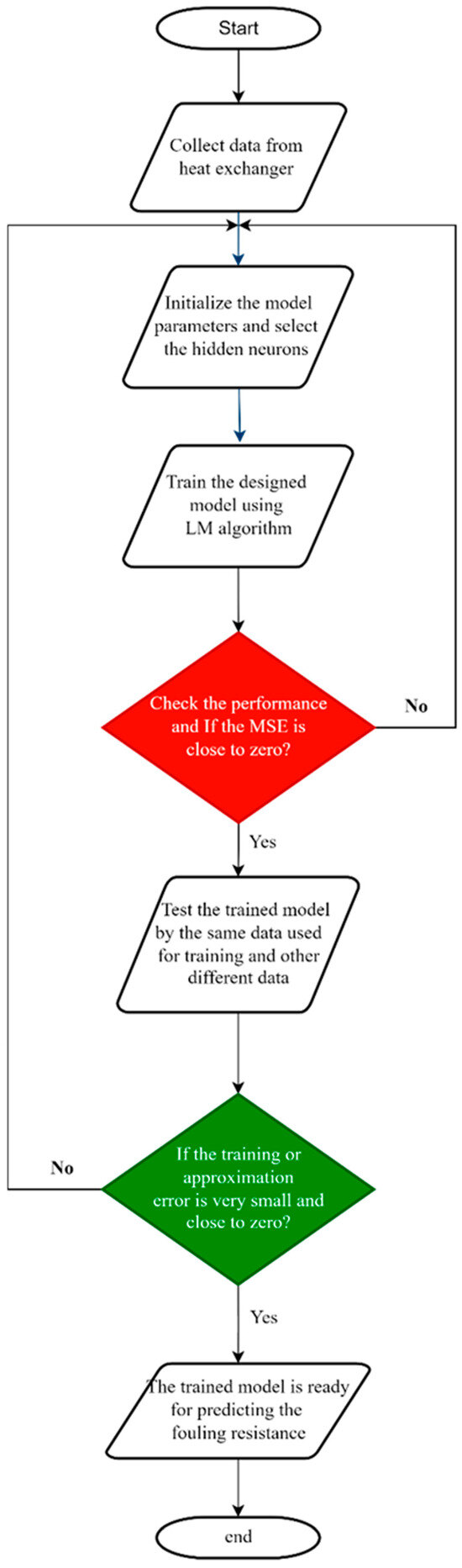 The first step in training and verifying the proposed model involves collecting data from the heat exchanger, which serves as an input for training the model. After the data are collected, the next step is to initialize the model parameters and select the number of hidden neurons in the hidden layer of the proposed neural network. The number of hidden neurons can affect the model’s performance and its ability to capture complex patterns in the data. Once the parameters are initialized, the model is trained using the Levenberg–Marquardt (LM) algorithm, which is a second-order optimization algorithm used to speed up the convergence process in neural network training. At this stage, the model is trained to minimize the error between the predictions and the actual data. After training is completed, the model’s performance is evaluated by checking whether the MSE is close to zero. If the MSE is still far from zero, the process returns to step three to adjust the model parameters or change the number of hidden neurons used, and then the model is retrained to achieve a smaller error.