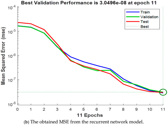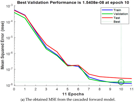 For the cascaded forward network, the number of hidden neurons is 15 and the process of training is completed in 2 s. In the case of the recurrent network, the number of hidden neurons is 10 and the training is completed in 35 s. This means that the training using the cascaded forward network is faster. The hidden neurons mentioned are obtained after many trial and error experiments until the smallest MSE value is achieved. The results from the training process including the mean squared error (MSE) and the regression are shown in Figure 6 and Figure 7.
