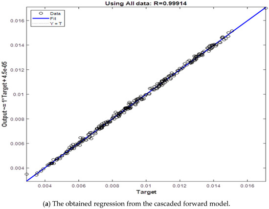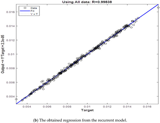 From Figure 6, the obtained MSE value is very small and close to zero in both models. This means that the models are trained efficiently. As can also be seen, the MSE using the cascaded forward model is 1.54 × 10−8, which is smaller than the corresponding value of the recurrent model, which is 3.05 × 10−8. This means that the cascaded forward model is the more accurate. From Figure 6, the regression value R is provided. The value R is very close to 1 in both models, which means that the estimated output by the model coincides with the actual output accurately. Using the cascaded forward model, the R value is 0.99914, which is larger than the corresponding value of the recurrent model. This proves that the cascaded forward model has higher accuracy in estimating the fouling resistance of a heat exchanger.