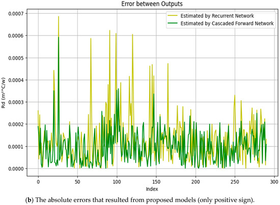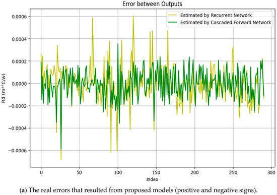 In this section, the total amount of data is used to test and verify the effectiveness of the trained models. The comparison between the actual output and the estimated ones by the cascaded network and the recurrent network is presented in Figure 8. As can be seen, the estimated outputs coincide with the actual output, which means that the proposed models are efficient in estimating the fouling resistance correctly. The error values between these outputs are presented in Figure 9. Figure 9a shows the values of the real error (positive and negative sign) and Figure 9b shows the values of the absolute error (positive sign). As shown in Figure 9, the error or the absolute error is very small and close to zero using any model. This means that the proposed models are trained very well. The error that resulted from the cascaded network is lower than the error that resulted from the recurrent model. This means that the cascaded forward network has higher performance and accuracy. As presented in Figure 10, the average value of the error for the proposed models is calculated and compared. The average value of the error in the case of the cascaded forward is equal to 9.80446 × 10−5, and the average value of the error in the case of the recurrent network is equal to 0.000126783. Therefore, this proves that the results obtained by the cascaded forward network are the best.