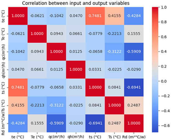 The correlation between the input variables of the proposed models is presented in Figure 11. Based on the correlation matrix displayed in Figure 11, there is a complex relationship between the variables related to the thermal efficiency of the system, represented by the output Rd (m2 °C/w). The inlet temperature of crude oil (te) has a moderate negative correlation with Rd, reaching −0.428. This indicates that an increase in the inlet temperature of crude oil tends to decrease the thermal efficiency of the system. On the other hand, the outlet temperature of crude oil (ts) shows a stronger negative correlation with Rd, at −0.694, suggesting that an increase in outlet temperature significantly reduces thermal efficiency. This demonstrates that temperature management at both points, at the inlet and outlet, is crucial, as higher outlet temperatures correspond to lower achieved thermal efficiency.